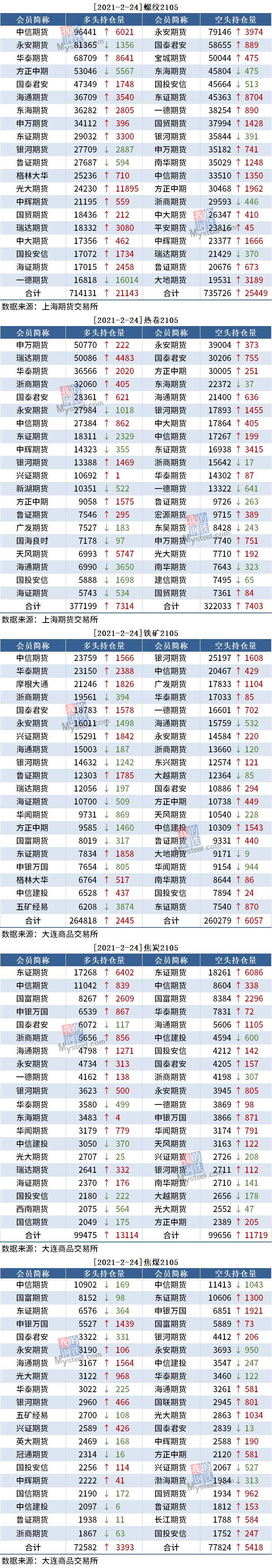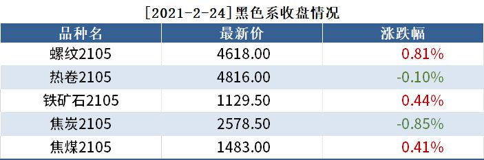 截至2月24日收盘,螺纹2105收4618,涨0.81%;热卷(4816, -5.00, -0.10%)2105收4816,跌0.1%;铁矿(1130, 5.00, 0.44%)石2105收1129.5,涨0.44%。