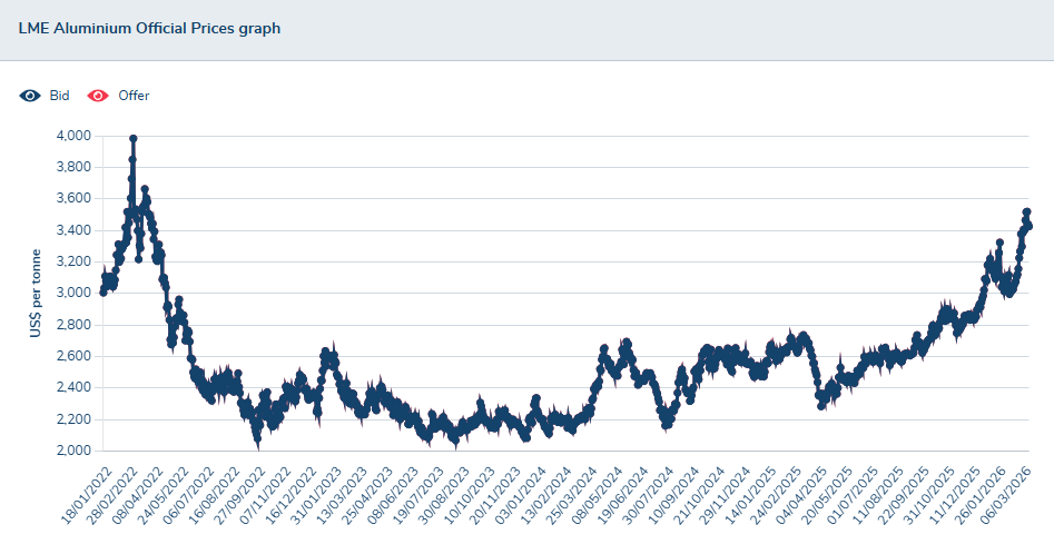 截至周三(3月18日)欧洲时段,铝价徘徊在每吨3400美元附近,接近四年来高点。