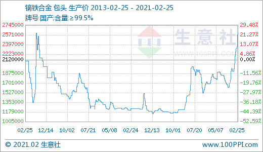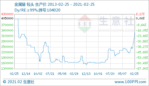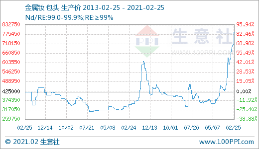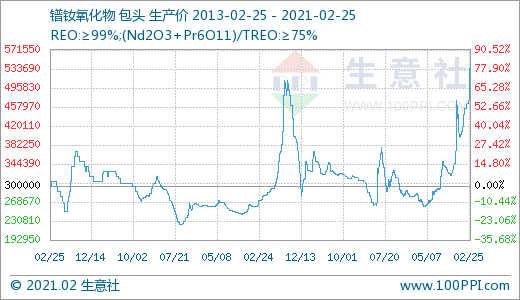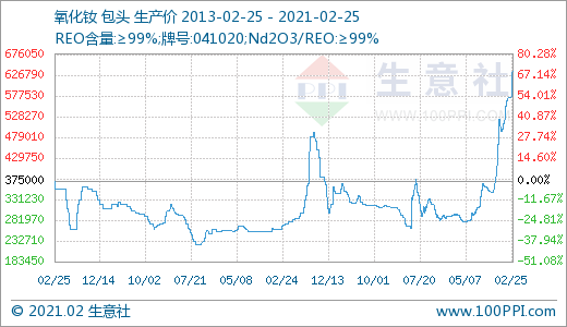 由产品价格走势图可以清晰的看出,国内镨钕氧化物,镨钕合金,氧化钕,金属钕等价格均达到8年新高,本轮上涨从2020年12月中旬开始一直没有停歇,场内价格持续大幅走高。截止2月25日国内稀土中镨钕氧化物价格为54万元/吨;镨钕合金价格为66.5万元/吨;氧化钕价格为63.5万元/吨;金属钕价格为78.5万元/吨,国内轻稀土市场行情涨势不断。