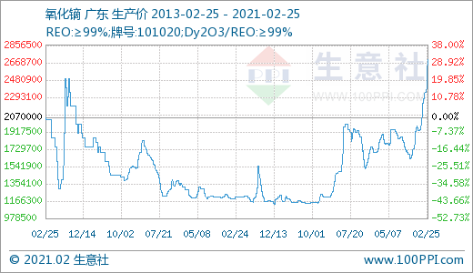 国内稀土行业大幅上涨主要是两个方面的带动,一方面近期国内大环境向好,场内多个有色产品屡创新高,铜,铝等产品涨幅高达40%以上,搭上行情上涨的顺风车,稀土产品价格持续上涨。另一方面是下游需求不断扩张,近期永磁需求持续增加,新能源汽车从2020一直火到了2021,上游材料稀土永磁也搭上了“顺风车”,据场内人士透露稀土缺口有可能会延续整个2021年。高性能钕铁硼主要稀土原料为轻稀土氧化镨钕、重稀土氧化镝及氧化铽,应用于新能源汽车、风电、节能变频空调、传统汽车等领域。据统计新能源汽车继续刷新单月销量历史纪录。中国汽车工业协会公布的数据显示,1月,新能源汽车产销分别完成19.4万辆和17.9万辆,同比分别增长285.8%和238.5%。下游需求上涨,据说需求缺口一直增大,国内轻稀土市场价格持续走高。近期国内重稀土市场铽系价格达到10年新高,镝系市场价格达到8年新高。