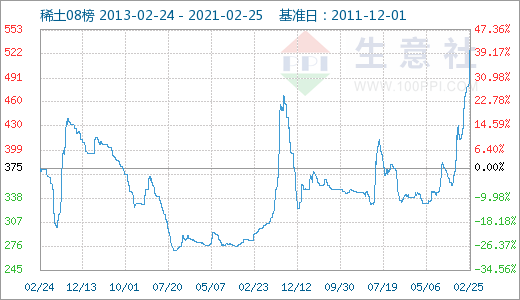 春节过后部分大宗商品价格一路狂犇,多个“破新高”“一飞冲天”行情不断上演,有色行业多个产品大幅上涨,稀土也不例外,所谓“强将手下无弱兵”,近期稀土市场价格屡创新高。据生意社监测显示国内稀土市场价格指数走势持续上涨,国内镨钕系稀土价格屡创新高,铽系市场价格上涨至10年新高,镝系价格创8年新高,国内稀土市场价格持续飘红,根据生意社稀土板块指数显示,2月24日稀土指数为516点,较昨日上升了18点,较周期内最高点1000点(2011-12-06)下降了48.40%,较2015年09月13日最低点271点上涨了90.41%。(注:周期指2011-12-01至今)。
