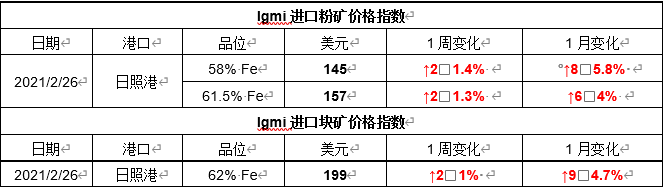 (2月22日-2月26日)本周进口铁矿(1151, 19.50, 1.72%)石价格再创新高。据兰格钢铁云商平台监测数据显示,截至2月26日,58%澳粉145美元/吨,较上周上涨2美元/吨;61.5%澳粉157美元/吨,较上周上涨2美元/吨;62%澳块199美元/吨,较上周上涨2美元/吨。