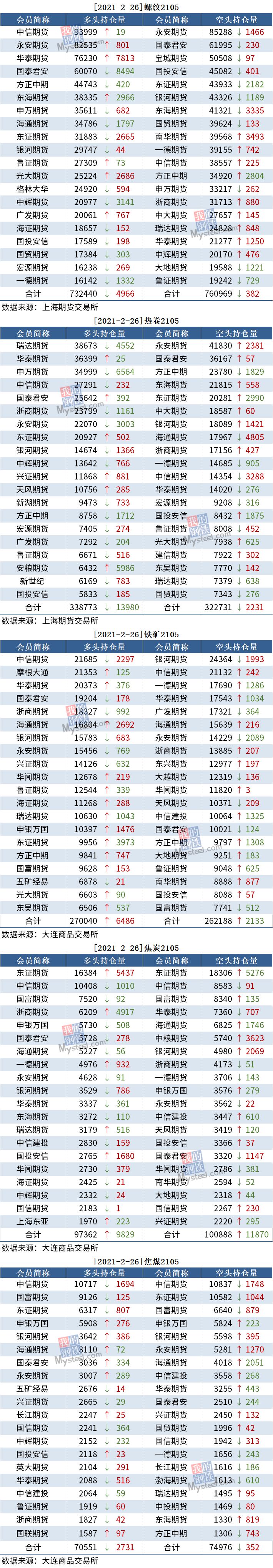 截至2月26日收盘,螺纹2105收4677,涨0.09%;热卷(4887, 16.00, 0.33%)2105收4887,涨0.33%;铁矿(1151, 19.50, 1.72%)石2105收1151,涨1.72%。
