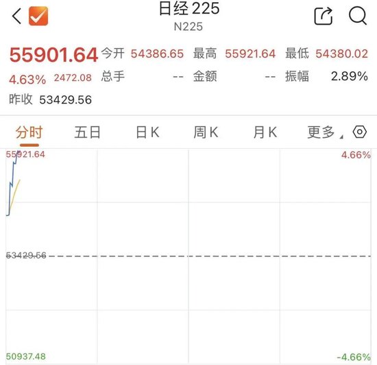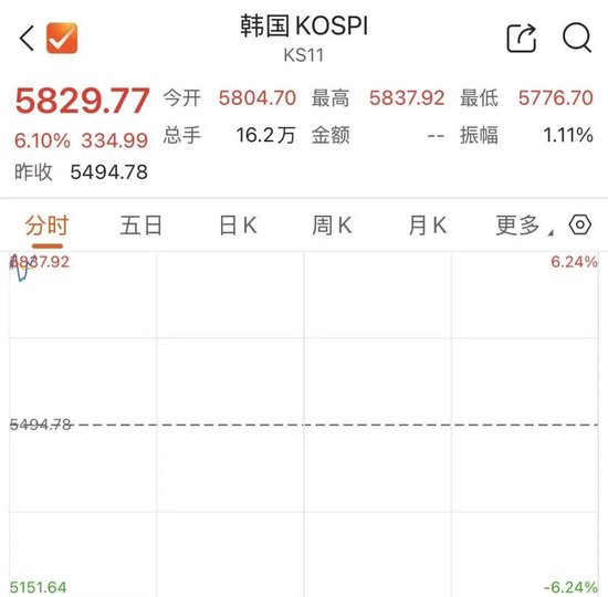 日经225指数开盘后直线拉升,截至发稿,涨幅扩大至涨4.6%,最新报55901.64点。韩国综合指数(KOSPI)上涨超6%,韩国交易所于KOSPI 200期货上涨5%后启动KOSPI指数熔断机制,程序化交易暂停5分钟。