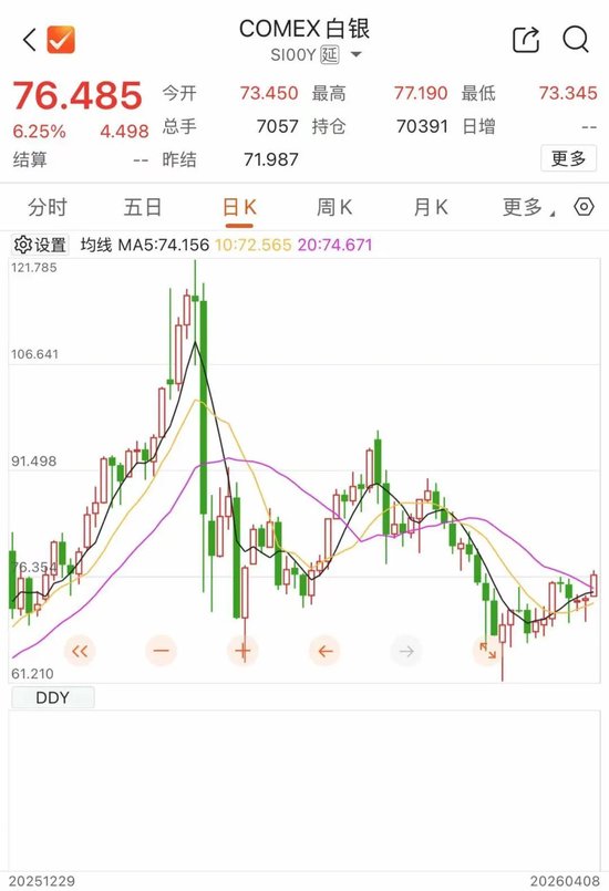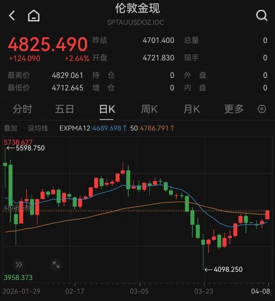 北京时间4月8日,国际金银价格开盘后直线拉升。伦敦现货黄金日内涨幅超过2%,盘中逼近4830美元/盎司;伦敦现货白银最高涨逾5%,最高价升破77美元/盎司。