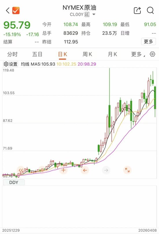 与此同时,国际油价迎来暴跌。WTI原油8日开盘大幅下挫,一度跌逾16%,最低下逼近91美元/桶。