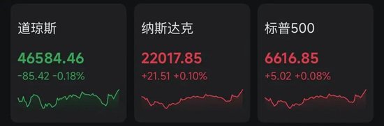 隔夜,美股市场三大指数涨跌不一,其中纳指和标普500指数录得四连涨。截至收盘,道指跌85.42点,跌幅0.18%,报46584.46点;纳指涨21.51点,涨幅0.10%,报22017.85点;标普500指数涨5.02点,涨幅0.08%,报6616.85点。