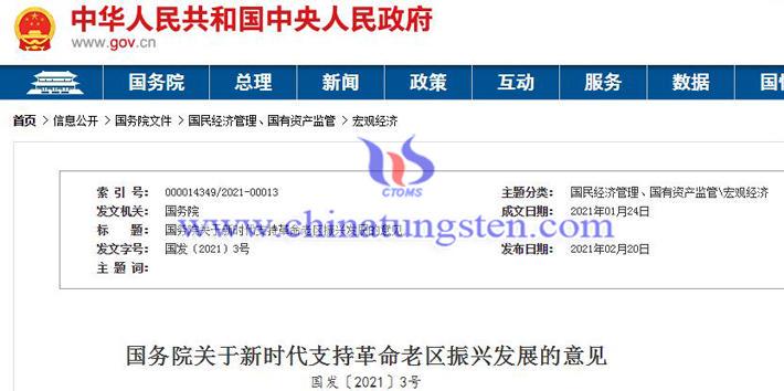 2021年2月20日,我国发布了《国务院关于新时代支持革命老区振兴发展的意见》,这将能在很大程度上促进钨稀土产业转型升级。报告指出,将推进“中国稀金谷”建设,研究中重稀土和钨资源收储政策,幷支持有条件的地区规划建设稀土、旅游等行业大数据中心。同时鼓励科研院所、高校与革命老区合作,共建中科院赣江创新研究院、国家钨与稀土产业计量测试中心等创新平台,研究建设稀土绿色高效利用等重大创新平台,支持有条件的地区组建专业化技术转移机构,创建国家科技成果转移转化示范区。