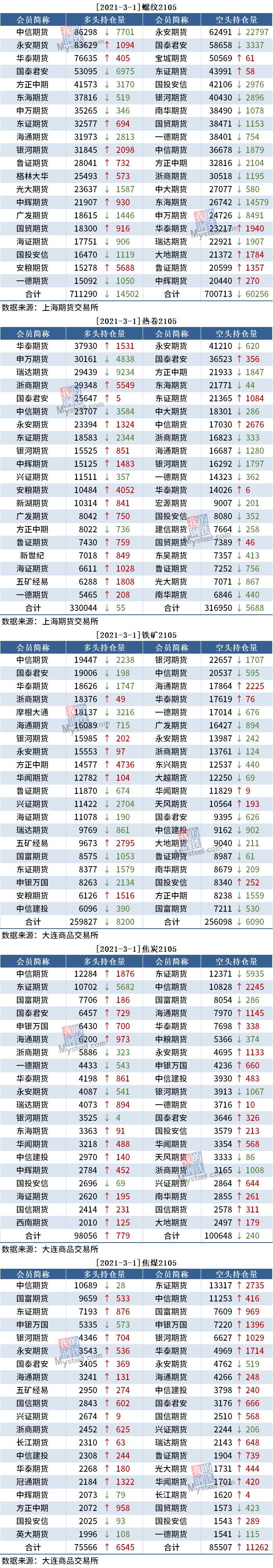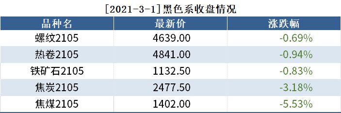截至3月1日收盘,螺纹2105收4639,跌0.69%;热卷(4841, -46.00, -0.94%)2105收4841,跌0.94%;铁矿(1133, -9.50, -0.83%)石2105收1132.5,跌0.83%。