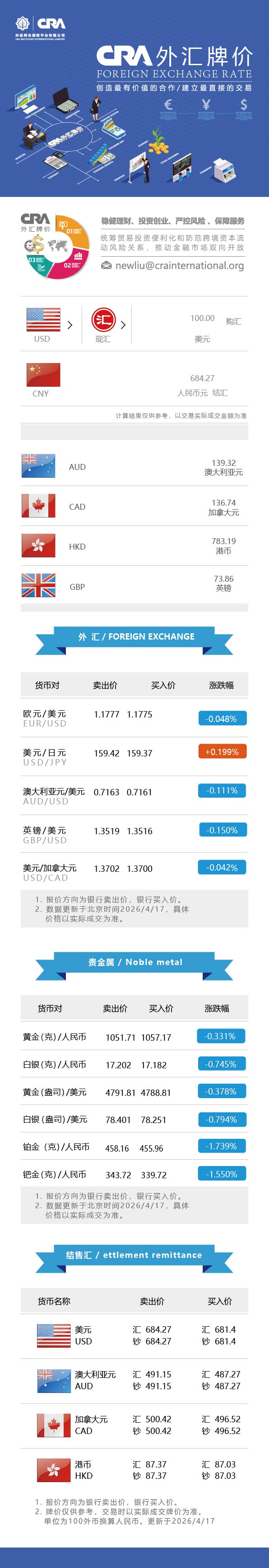 4月17日CRA贵金属及外汇市场价