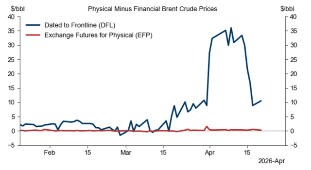 数据显示,用于衡量现货与期货价差的DFL(Dated-to-Frontline)指标一度飙升至近40美元/桶,尽管近期回落至约10美元/桶,但仍处于历史高位