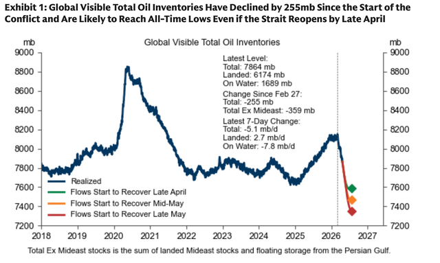高盛警告称,即便在相对乐观的情景下——霍尔木兹海峡于4月底逐步恢复通行——全球库存仍将跌至历史低位,并可能在5月继续下降。