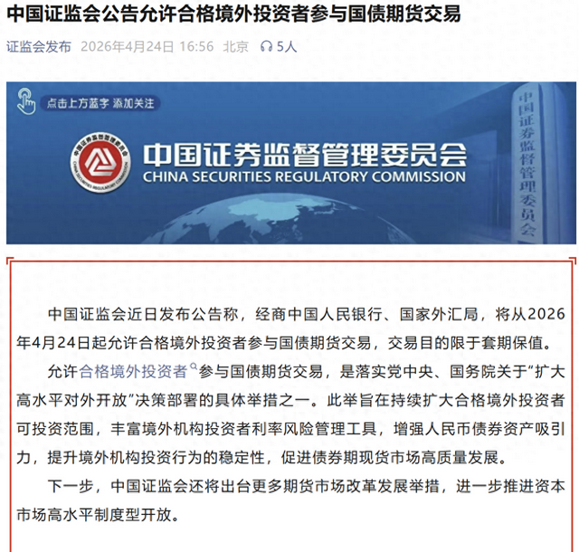 【环球网财经综合报道】中国证监会近日发布公告称,经商中国人民银行、国家外汇局,将从2026年4月24日起允许合格境外投资者参与国债期货交易,交易目的限于套期保值。