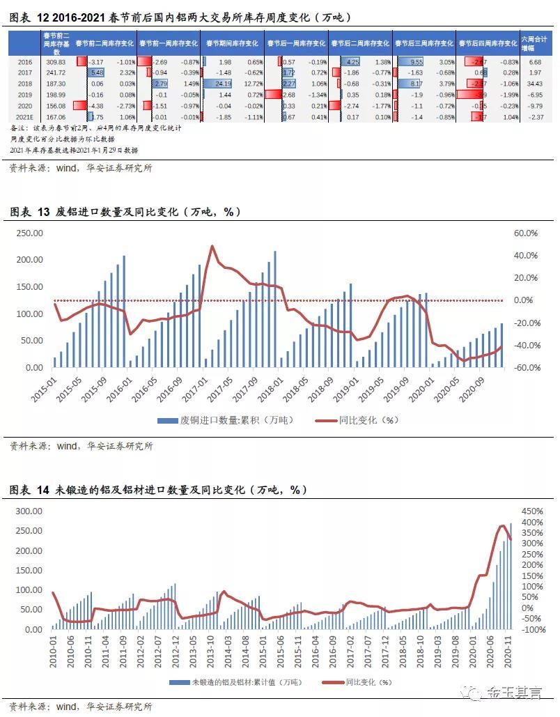 受2017年以来供给侧改革影响,以及在下游消费需求持续向好背景下,铝厂生产产能利用率接近饱和。关于碳中和对铝行业的影响,市场认为企业会在碳中和政策背景下优化产品性能及结构,进而做出减碳的贡献。与铜终端市场情况类似,铝的终端需求企业对铝等的原材料价格敏感度较低,目前仍按照原定生产计划开展生产活动。关于废铝市场,2020年国内废铝开启增长周期,预计每年增长60-70万吨;国内每年进口废料数量都有所增加。市场预计短期内废铝进口政策或将趋于严格,海外废铝供给增量或低于往年。氧化铝方面,海内外氧化铝产能过剩现象较为严重,其中海外氧化铝品质以及生产成本都优于国内,并且氧化铝产能释放以及生产周期均明显短于电解铝的生产,氧化铝产能过剩的现状短期难以改变。