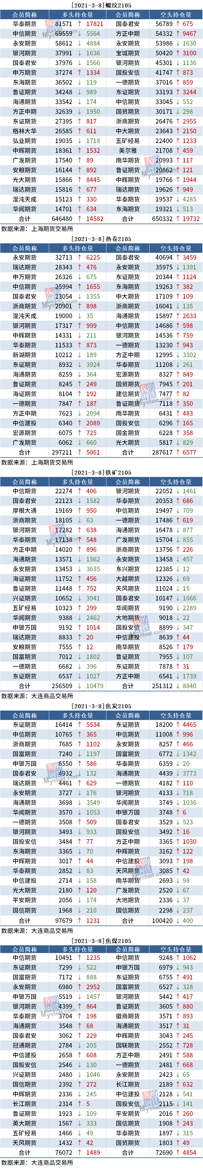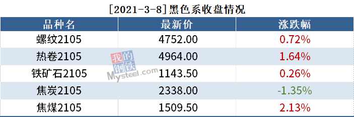 截至3月8日收盘,螺纹2105收4752,涨0.72%;热卷(4964, 80.00, 1.64%)2105收4964,涨1.64%;铁矿(1144, 3.00, 0.26%)石2105收1143.5,涨0.26%。