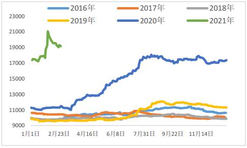 3月,全球股市波动对金银价格影响负相关将更加显著,金银抗通胀属性较弱,资产相互替代将加重金银价格的压力。2月末,美债收益率高于1.5%美债分红率时,美股回调风险担忧剧增,美股指数一度大幅回落,市场情绪一度恐慌。另外,虚拟货币交易火热也消耗了金银价格的吸引力。目前资产价格回调风险都处于高位,所以资产之间的资金流动替代性讲加强,即美股和金银价格的负相关性将加强。