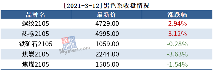 截至3月12日收盘,螺纹2105收4729,涨2.94%;热卷(4995, 151.00, 3.12%)2105收4995,涨3.12%;铁矿(1059, -3.00, -0.28%)石2105收10595,跌0.28%。