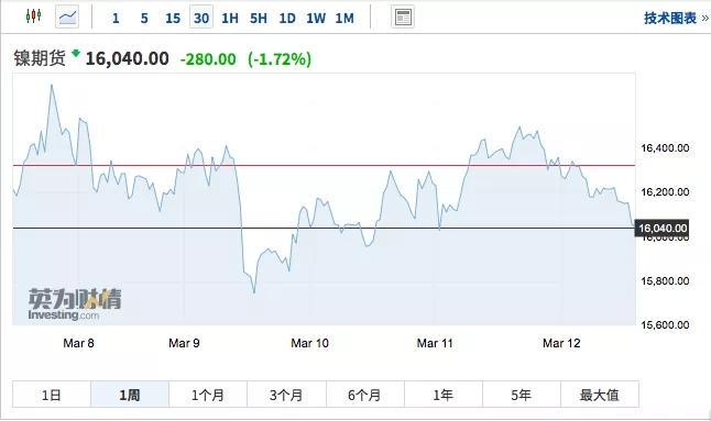 3月初,伦敦期镍曾升至七年高点20110美元/吨。但随后,镍价从高位跳水。4日,伦敦期镍创下2016年以来最大单日跌幅。11日,伦镍终结三日连跌,截至记者发稿时,伦镍报16040美元/吨。