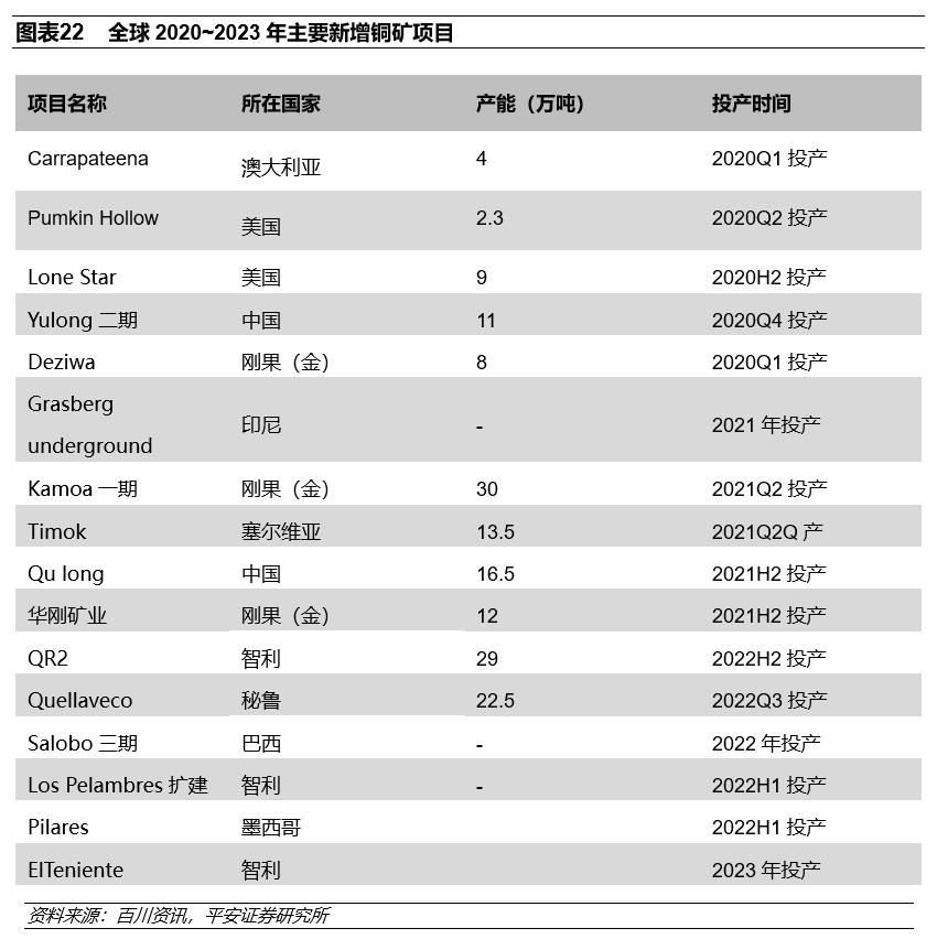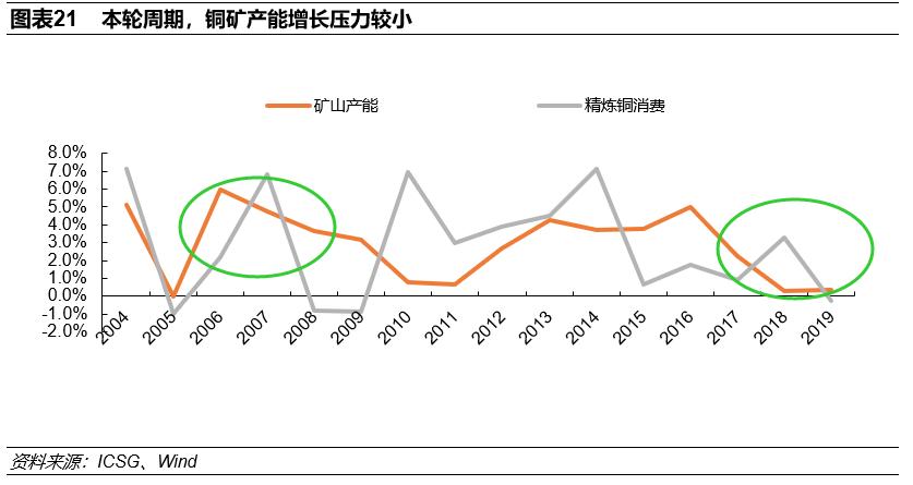 在铜的产业链中,上游铜矿具有较强的资源属性,对精炼铜的供给也具有重大影响,是铜行业分析的关键环节。通过铜矿产能分析,我们可以发现,本轮铜周期启动前,铜矿产能供给的高峰已过,2018年、2019年连续两年铜矿产能增速低于1%,铜供给压力较小。而上轮周期中前,铜矿扩产力度较大,铜矿产能释放对铜价构成隐患。