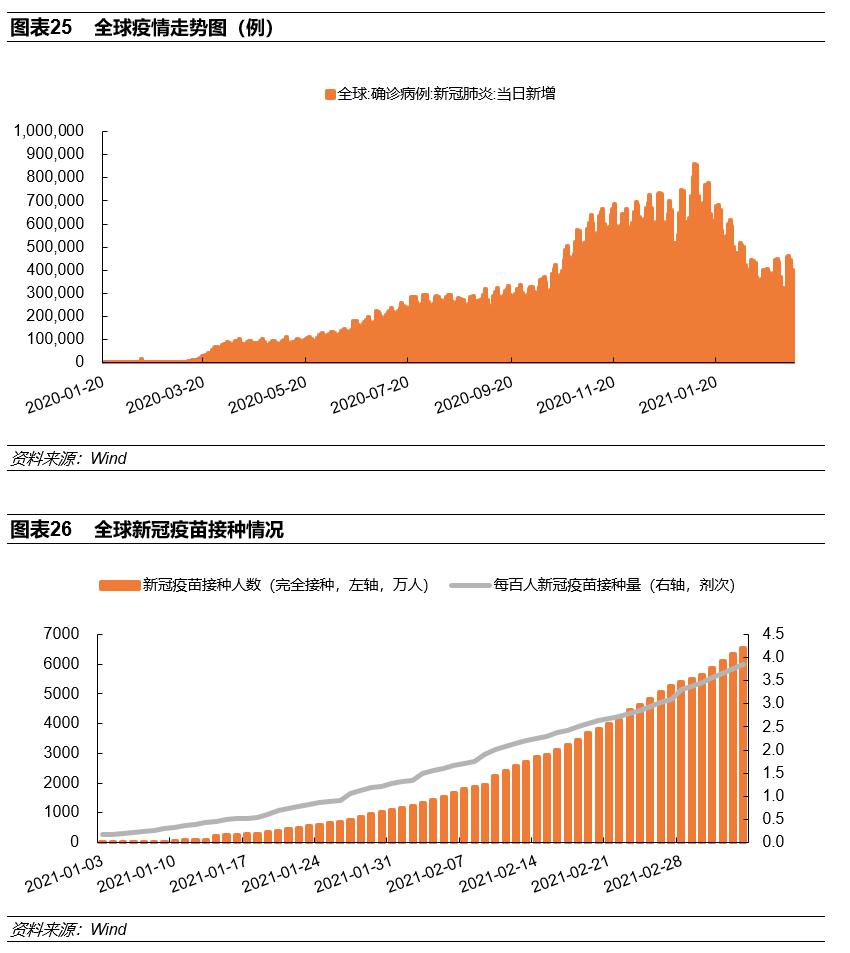 如前所述,本轮铜周期由疫情导致,因此,疫情判断对全球及美国经济走势具有重要参考意义。从日新增新冠病毒病例来看,疫情大致上经过了疫情初期,恶化、二次爆发以及减弱几个阶段。随着2020年底疫苗推出,接种人数持续增加,疫情较严重美国防控措施也在增强,全球新冠病毒日新增病例在2021年2月底开始大幅下降,未来疫情度过最黑暗时期,逐步缓解的可能性增加。