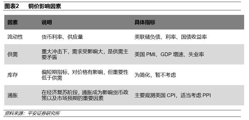 由于铜属于全球定价市场,受美国经济以及美联储的影响较大,我们将通过铜价变化和经济以及货币政策变化关系,同时参考铜自身供需,了解铜价变化规律。主要观察指标如下表。