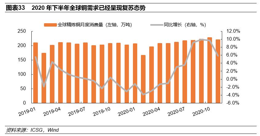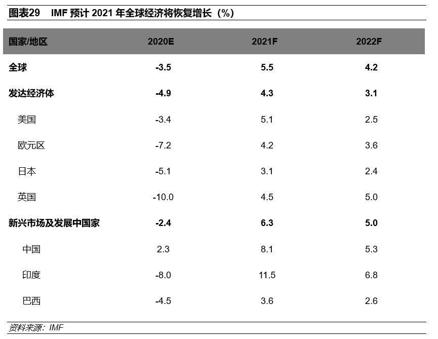 本轮铜周期由疫情冲击导致,疫情逐步缓解将对经济起到十分积极的作用。IMF(世界货币基金组织)多次上调2021年全球经济增长预测,根据其2021年1月发布的展望,预计2021年全球经济将呈现较为强劲的复苏,同比增长5.5%,其中2021年美国、欧元区、中国将分别增长5.1%、4.2%和8.1%。