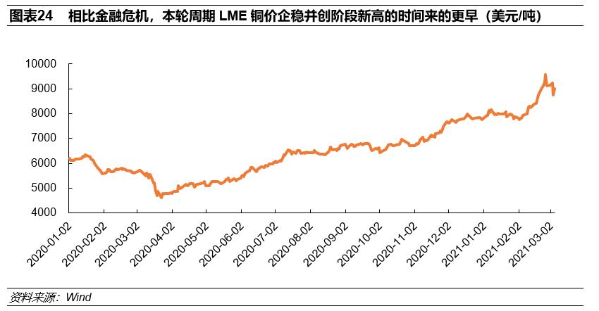 参考上轮经济复苏阶段铜价表现,我们认为目前经济复苏和货币政策仍支持铜价上行,铜价上行的大趋势没有方向性的改变。但由于通胀及国债收益率从低点抬升,市场对包括大宗商品在内资产价格定价重新审视,铜价上行中波动的可能性增加。
