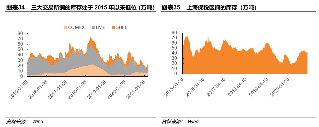 库存维度:尽管2021年以来,上海期货交易所(SHFE)铜库存有所增加 ,但如我们把伦敦期货交易所(LME)、芝加哥商品交易所(COMEX)库存一并考虑,则全球三大交易所铜显性库存处于2015年的低位。同时中国上海保税区现货库存尽管2020年四季度以来,因国内需求较快复苏,现货价升水,境外铜流入,导致库存持续增长,但2021年以来趋于稳定,并没有显著增长。可见,目前无论是交易所的显性库存还是国内现货库存压力均较小。