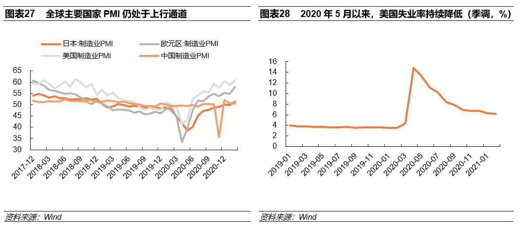 而在货币政策上,美联储在2021年首次议息中,重申了“在经济达到委员会评估的最大就业水平且通胀达到2%并短期内收敛于稍高于2%水平之前,保持联邦基金利率0-0.25%不变”,并保持每月800 亿美元的美国国债和400 亿美元MBS 购买速度。可见,现阶段美联储并未对通胀感到过度担忧,仍致力维持宽松货币政策助力经济复苏。美国联邦政府将推出1.9万亿美元财政刺激计划,将进一步增强美国经济复苏的确定性。另一方面,由于经济复苏预期较为强烈,美国国债收益率和美元指数均出现了一定上行。