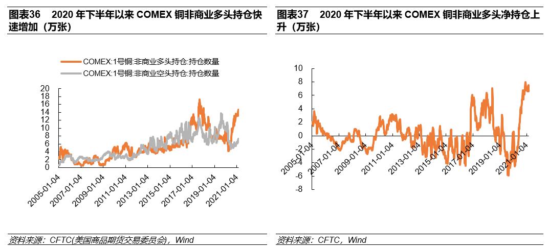 库存和期货持仓有利铜价上行。尽管2021年以来,上海期货交易所铜的库存有所上升,但三大交易所铜的显性库存仍处于2015年以来较低位置,总体库存压力较小。期货定价市场方面,从对铜价较敏感的COMEX非商业期货持仓看,2020年下半年起,多头持仓快速增加,多头净持仓由负转正,2021年初创出2005年以来新高。目前多头持仓依然保持增长,期货定价市场仍看高铜价。