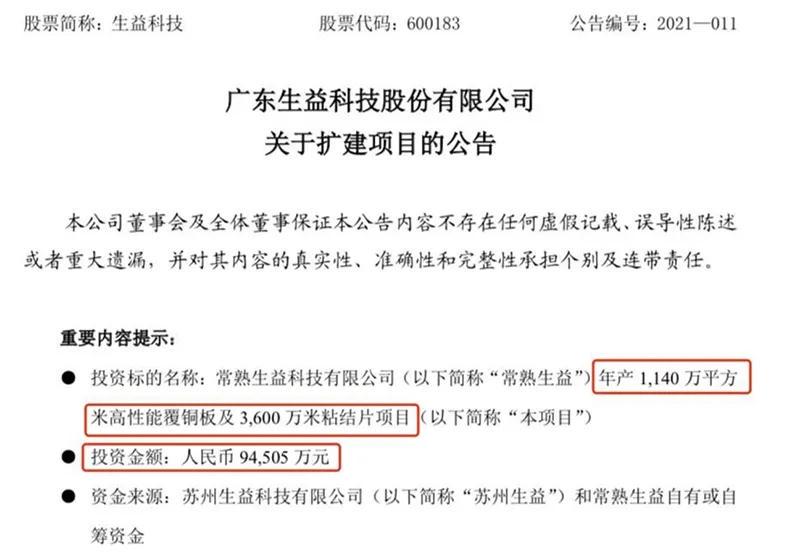 今年年初,生益科技公告,公司拟投资建设常熟生益科技有限公司年产1140万平方米高性能覆铜板及3600万米粘结片项目,投资总额9.45亿元。