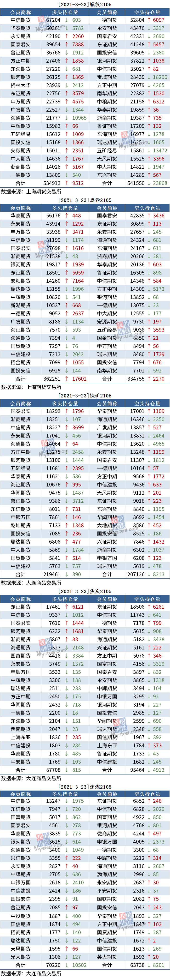 截至3月23日收盘,螺纹2105收4715,跌1.77%;热卷(5128, 11.00, 0.21%)2105收5128,涨0.21%;铁矿石2105收1039.5,涨2.01%。