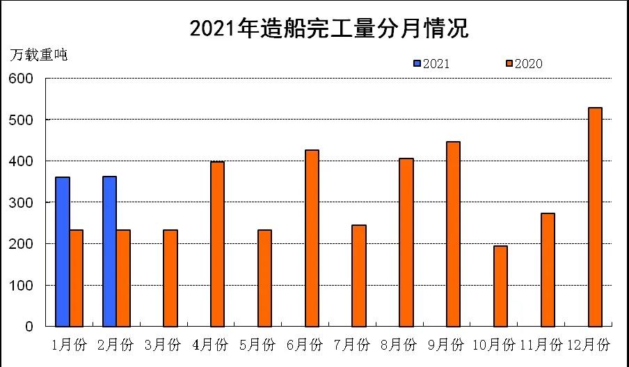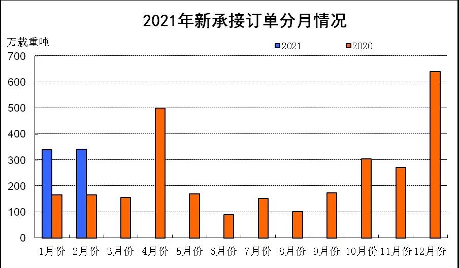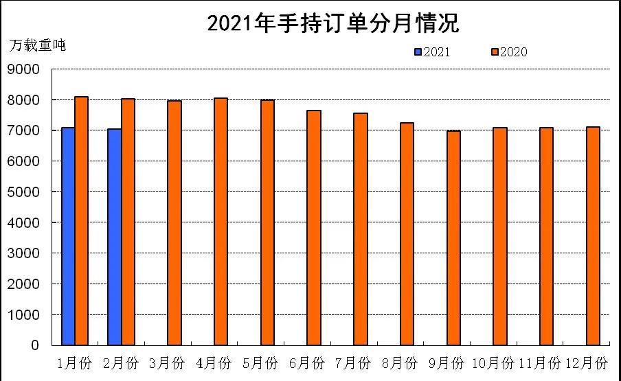 1~2月份,全国造船完工723万载重吨,同比增长54.7%。承接新船订单681万载重吨,同比增长105%。2月底,手持船舶订单7051万载重吨,同比下降12.2%,比2020年底下降0.8%。