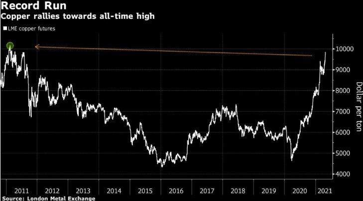 外媒报道,随着刺激措施、疫苗推广和气候承诺推动全球从疫情中复苏,铜价正在加速向10000美元上方的历史高点攀升,多头纷纷进场获利。