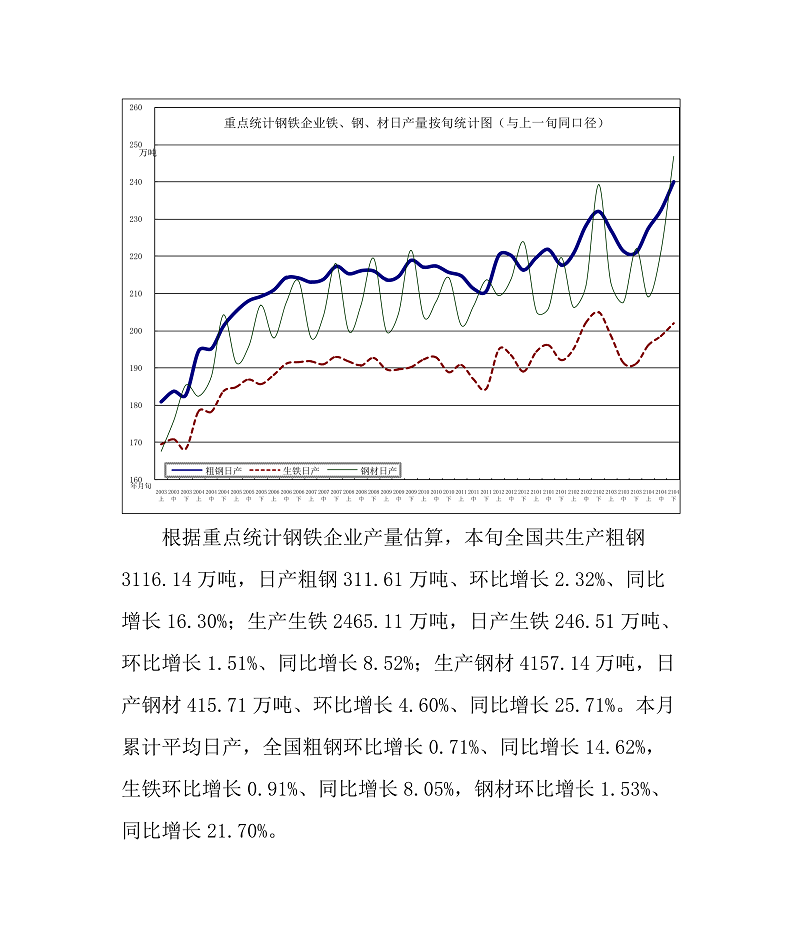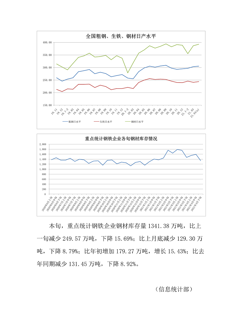 2021年4月下旬,重点统计钢铁企业粗钢日均产量239.98万吨,环比增长3.25%,同比增长19.27%;钢材库存量1341.38万吨,较上一旬减少249.57万吨,下降15.69%。