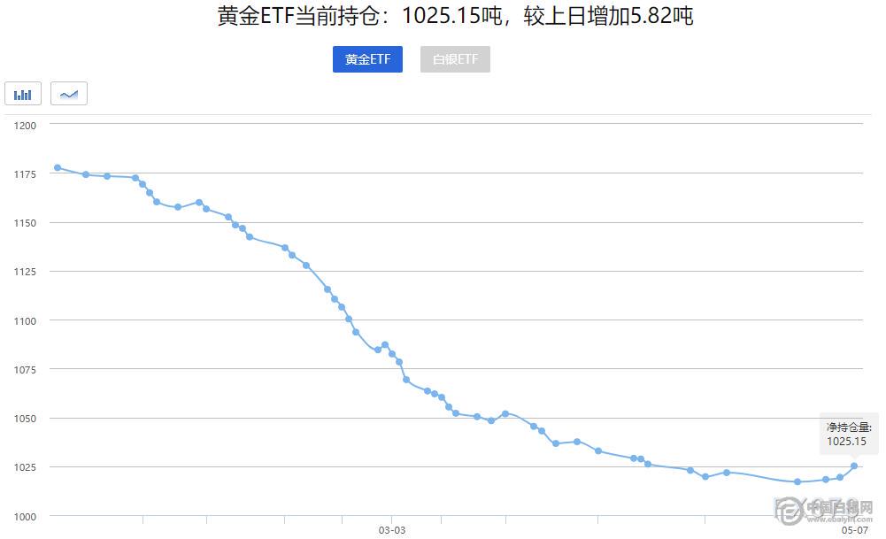 5月8日黄金ETFs数据显示,截止5月7日全球最大的黄金ETF-SPDR Gold Trust的黄金持仓量1025.15吨,较上一交易日增加5.82吨,增持数量为1月15日以来最多。