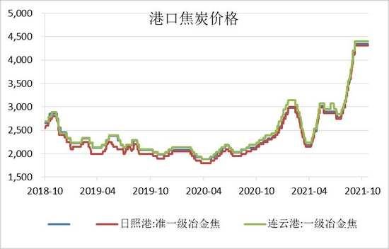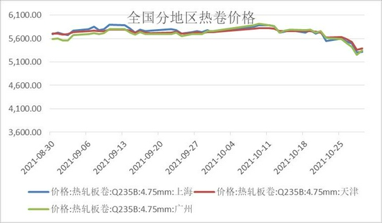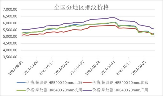 十一长假结束,钢厂限电限产力度有所放松,产量出现触底反弹,叠加旺季需求偏弱等因素,钢价出现高位回落。进入十月末,以动力煤(931, 39.00, 4.37%)为首的煤炭价格的持续过热上涨引发上层高度重视,政策强力干预之下煤炭高位下跌,拖累黑色系品种全线下跌。截至10月29日,螺纹2201合约收于4646元/吨,月跌幅17.11%,热卷(4638, 94.00, 2.07%)2201合约收于5003元/吨,月跌幅10.85%。现货方面,10月传统消费旺季,但今年下游需求偏差,终端采购刚需为主,尤其是中下旬盘面价格下跌,抑制投机需求,现货价格同样下跌但跌幅小于期货。截至10月末上海螺纹现货5240元/吨,月跌幅10.43%;上海热卷现货5320元/吨,月跌幅7.32%。