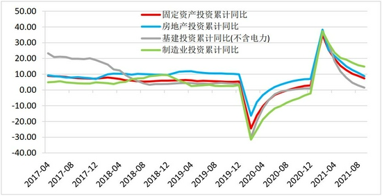 1-9月,全国制造业投资同比增长14.8%,两年平均增速为3.3%,环比持平;9月当月制造业增速10%,环比增加3个百分点。工业企业生产方面,1-9月,规模以上工业增加值同比增长11.8%,9月规模以上工业增加值同比增长3.1%,环比下降2.2个百分点。总体来看制造业在三大投资领域中算是最具韧性的一个,但由于大宗商品持续高价,以及三季度以来的限电因素,制造业投资内外环境受抑制,影响制造业企业投资生产,导致增速出现环比下降。不过长线来看,政策支撑将不断向制造业倾斜,削弱地产在经济增长中的比重,因此未来可以关注卷螺差走阔的长期策略。