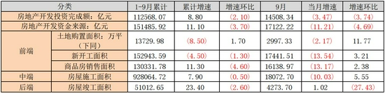 下半年开始,地产投资增速下行压力增大:前端融资压力持续,终端销售回款也开始高位回落,房企受前后夹击,投资增速不断回落,9月当月增速年内也首次转负。具体看,1-9月房地产开发资金来源累计增加11.1%,前值为14.8%,其中国内贷款、自筹资金和其他资金来源均出现增速回落情况,并且降幅最大的是定金及预收款和个人按揭贷款。从销售端数据也可以验证:1-9月商品房销售面积增速11.3%,回落4.6个百分点,当月增速已连续三个月负增长,其中期房销售增速拖累最大。大型房企出现信用违约事件导致居民购房意愿下降,负反馈逐步传导,增加房企回笼资金的难度,相当于破坏了今年以来房企赖以维生的一条回血途径,也就直接导致9月投资增速转负,未来也会继续拖累新开工和竣工等前端投资行为。总体来看,房企资金收紧,销售高位回落,前端投资被迫放缓,中长期将向中后端负向传导,即地产投资下行趋势基本确定,对于明年建筑钢材消费是较大的潜在风险点。