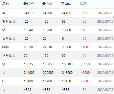 6月28日上海有色金属交易市场价