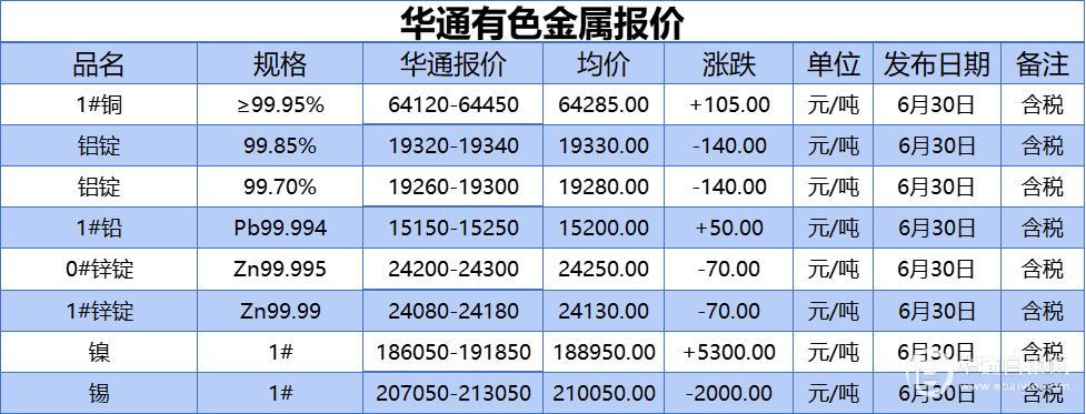 华通白银网6月30日讯:1#铜、铝锭(99.85%)、铝锭(99.70%)、1#铅、1#锌、0#锌、镍、锡报价