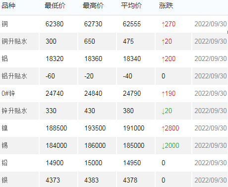 9月30日上海有色金属交易市场价