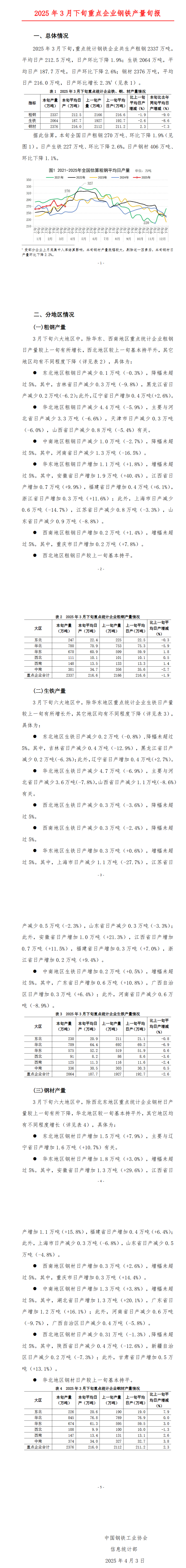2025年3月下旬,重点统计钢铁企业共生产粗钢2337万吨,平均日产212.5万吨,日产环比下降1.9%;生铁2064万吨,平均日产187.7万吨,日产环比下降2.6%;钢材2376万吨,平均日产216.0万吨,日产环比增长2.3%。
