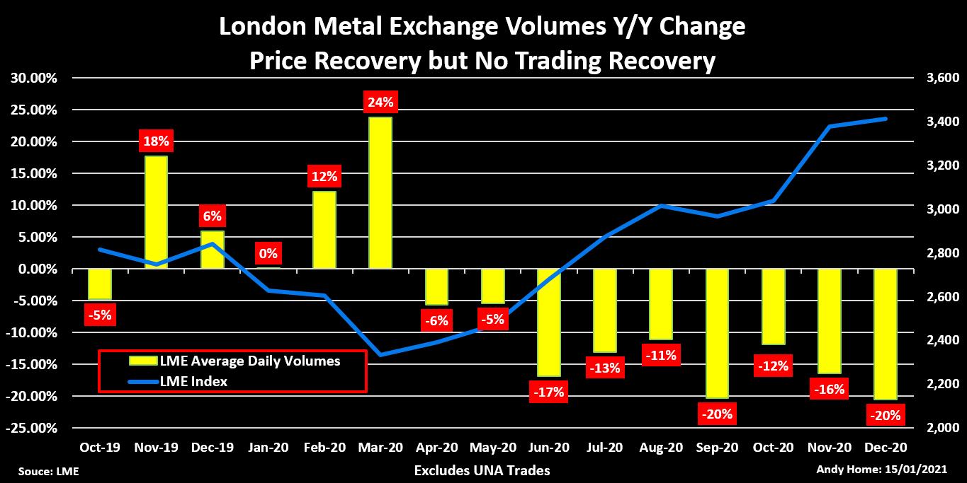 2020年下半年交易活动的急剧下降,与贱金属价格的超强上涨同时出现,这表明,在仍是主要对冲论坛的行业参与者中,普遍缺乏买盘。