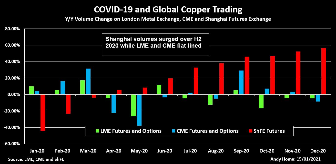 伦敦金属交易所(LME)的铜交易量在2020年下降了2%,而芝加哥商品交易所的交易量仅上升了0.3%。