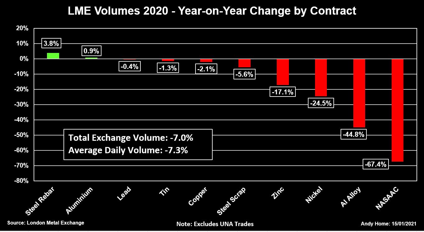 全年,只有两种LME已建立的合约——钢筋和铝——销量有所增长,分别仅为4%和1%。