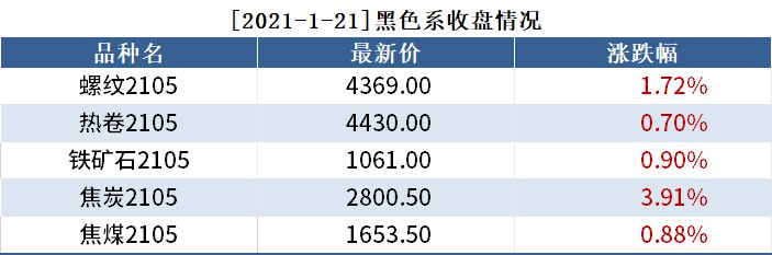 截至1月21日收盘,螺纹2105收4369,涨1.72%;热卷(4430, 31.00, 0.70%)2105收4430,涨0.70%;铁矿(1061, 9.50, 0.90%)石2105收1061,涨0.90%。