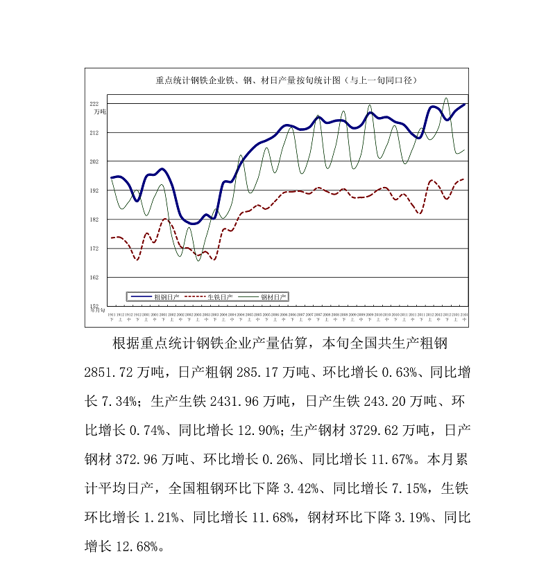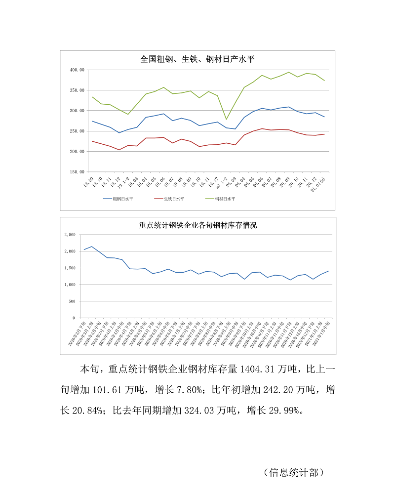 2021年1月中旬重点钢企粗钢日均产量221.81万吨,环比增加1.02%,同比增长12.33%。1月中旬重点钢铁企业钢材库存量为1404.31万吨,比上一旬增加101.61万吨,增长7.80%;比去年同期增加324.01万吨,增加29.99%。