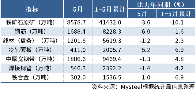 5月份,中国铁矿(805, -22.00, -2.66%)石原矿产量为8578.7万吨,同比下降3.6%;1-5月累计产量为41432.0万吨,同比下降10.1%。