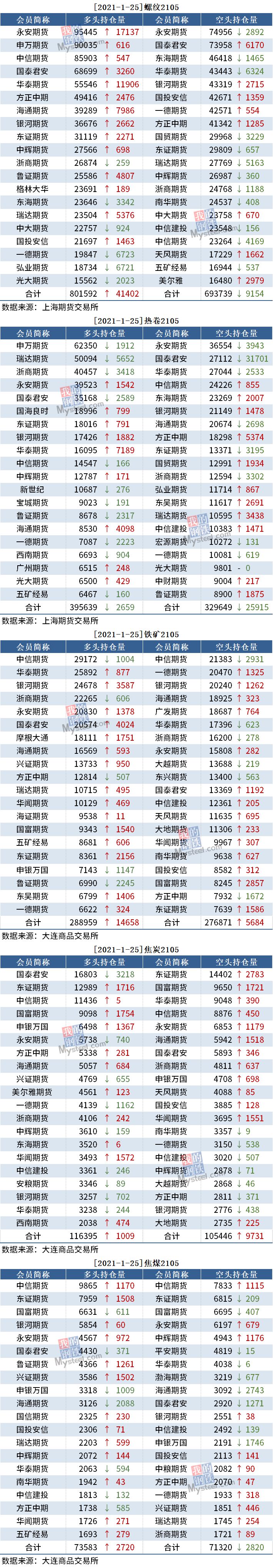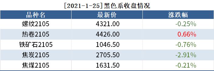 截至1月25日收盘,螺纹2105收4321,跌0.25%;热卷(4426, 29.00, 0.66%)2105收4426,涨0.66%;铁矿(1047, -8.00, -0.76%)石2105收1046.5,跌0.76%。